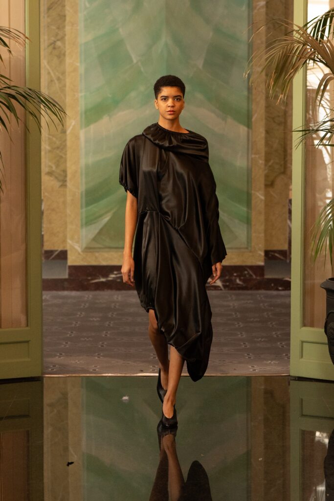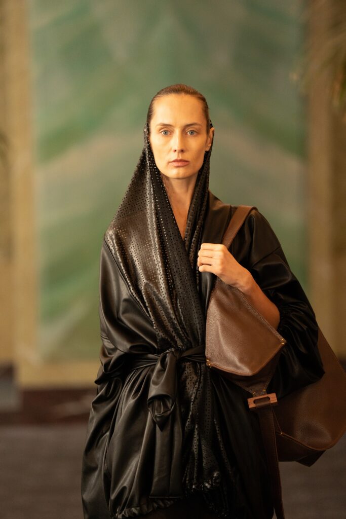 Kolekcija istražuje suvremenu ženstvenost kroz snažne, skulpturalne siluete i izraženu arhitektonsku konstrukciju odjeće. Dominantna crna paleta stavlja naglasak na formu, pokret i volumen, dok kombinacija umjetne kože i muslina stvara dinamičnu igru svjetla i sjene, spajajući čvrstoću i refleksiju s prozračnošću i mekoćom. Prozirni komadi s dugim rukavima kontrastiraju komadima od umjetne kože, naglašavajući balans između lakoće i strukture te dopuštajući igru slojevima. Svaki odjevni predmet osmišljen je kao dio modularne kapsul kolekcije, što znači da se svi komadi mogu međusobno kombinirati i nositi na različite načine, stvarajući fleksibilan garderobni sistem.
